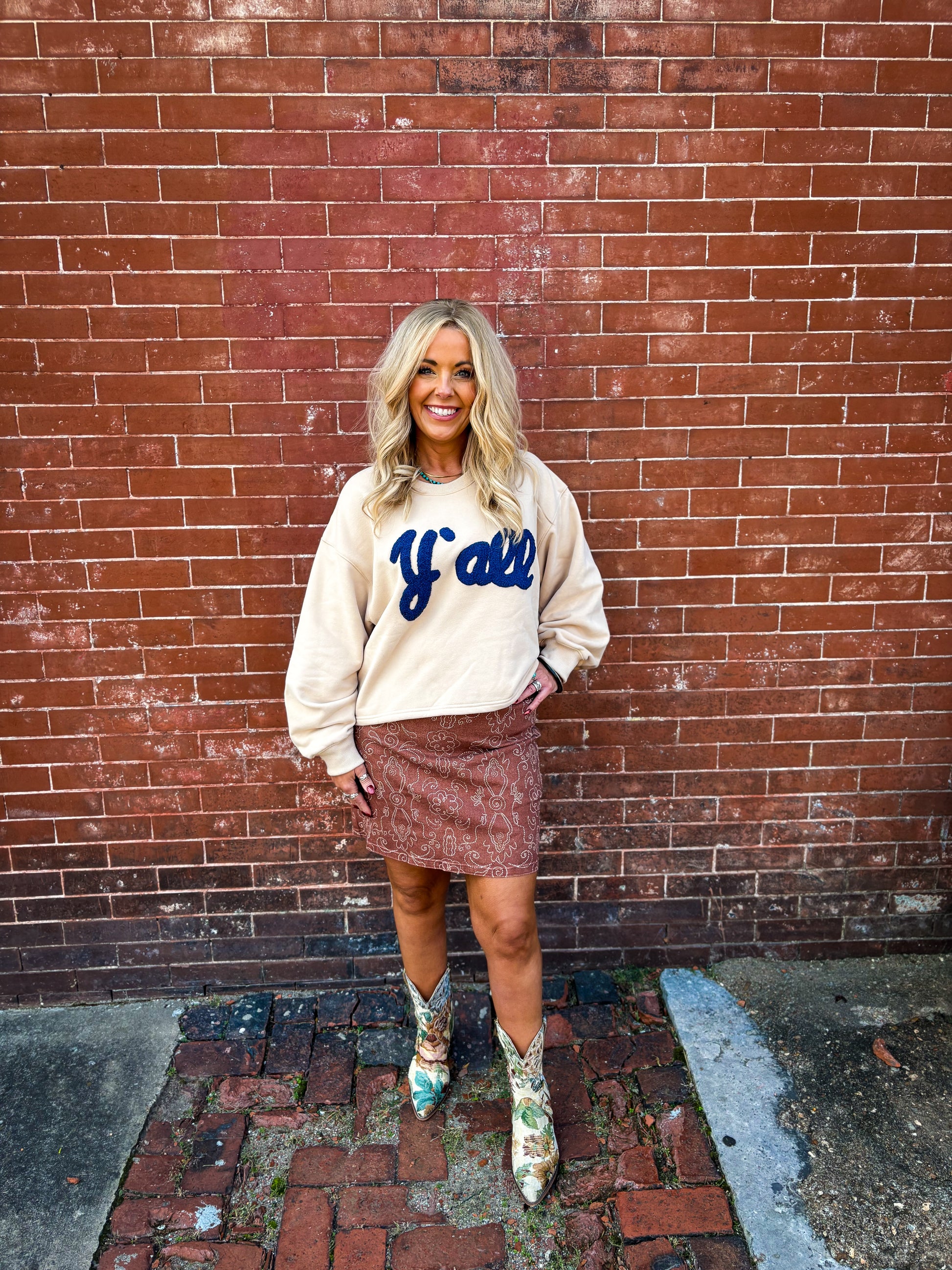 Turn heads in this desert rose mini skirt, featuring a subtle paisley-inspired print that’s equal parts sweet and sassy. The soft fabric and flattering fit make it perfect for pairing with boots and a tucked-in sweater for that cowgirl-meets-cozy look.