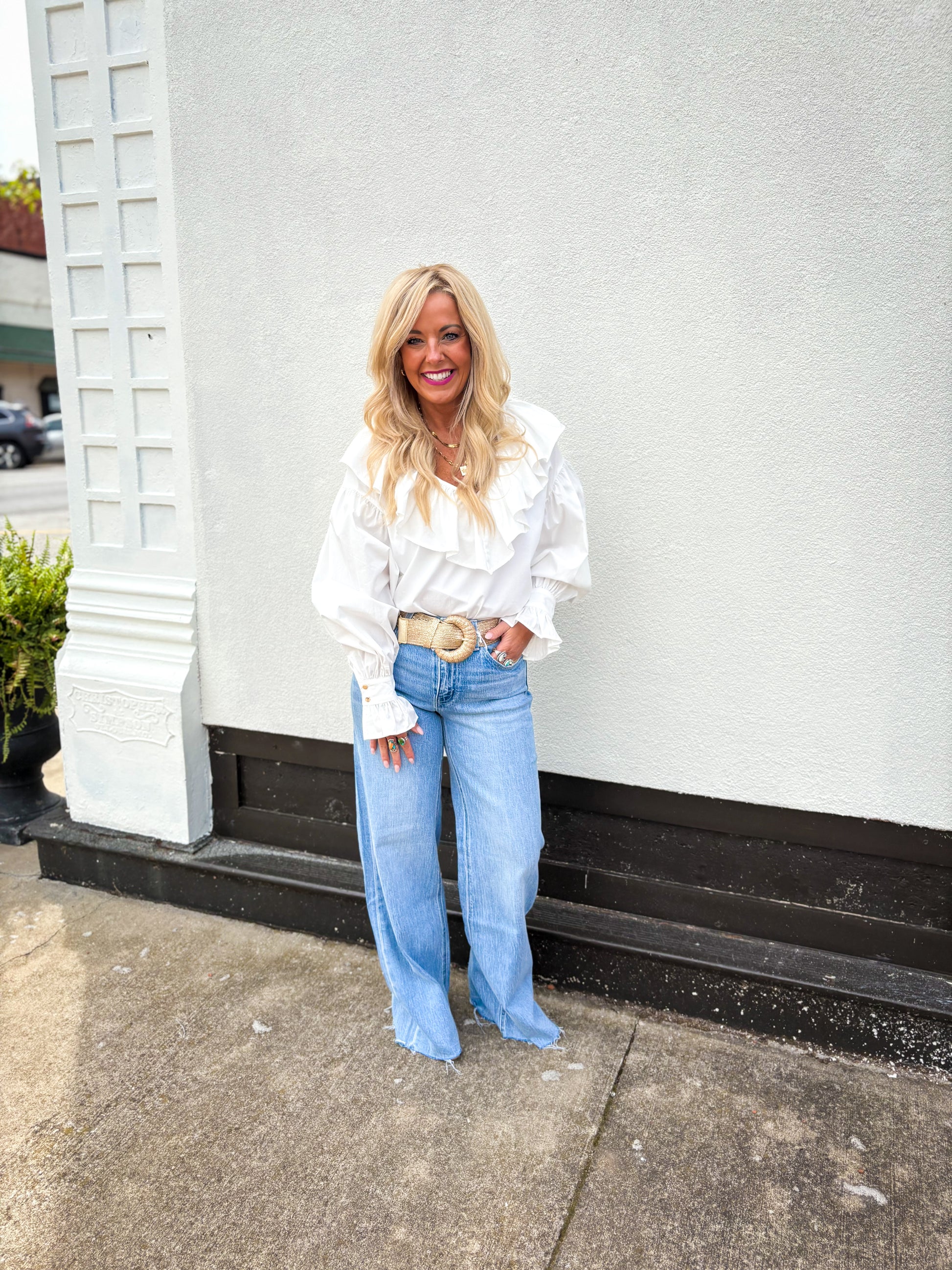 We are loving this top! We have it styled with our Olivia wide legs and all the gold accessories! The puff sleeve and ruffle v-neck give this top so much detail! Great for everyday wear, office wear, or even a date night!