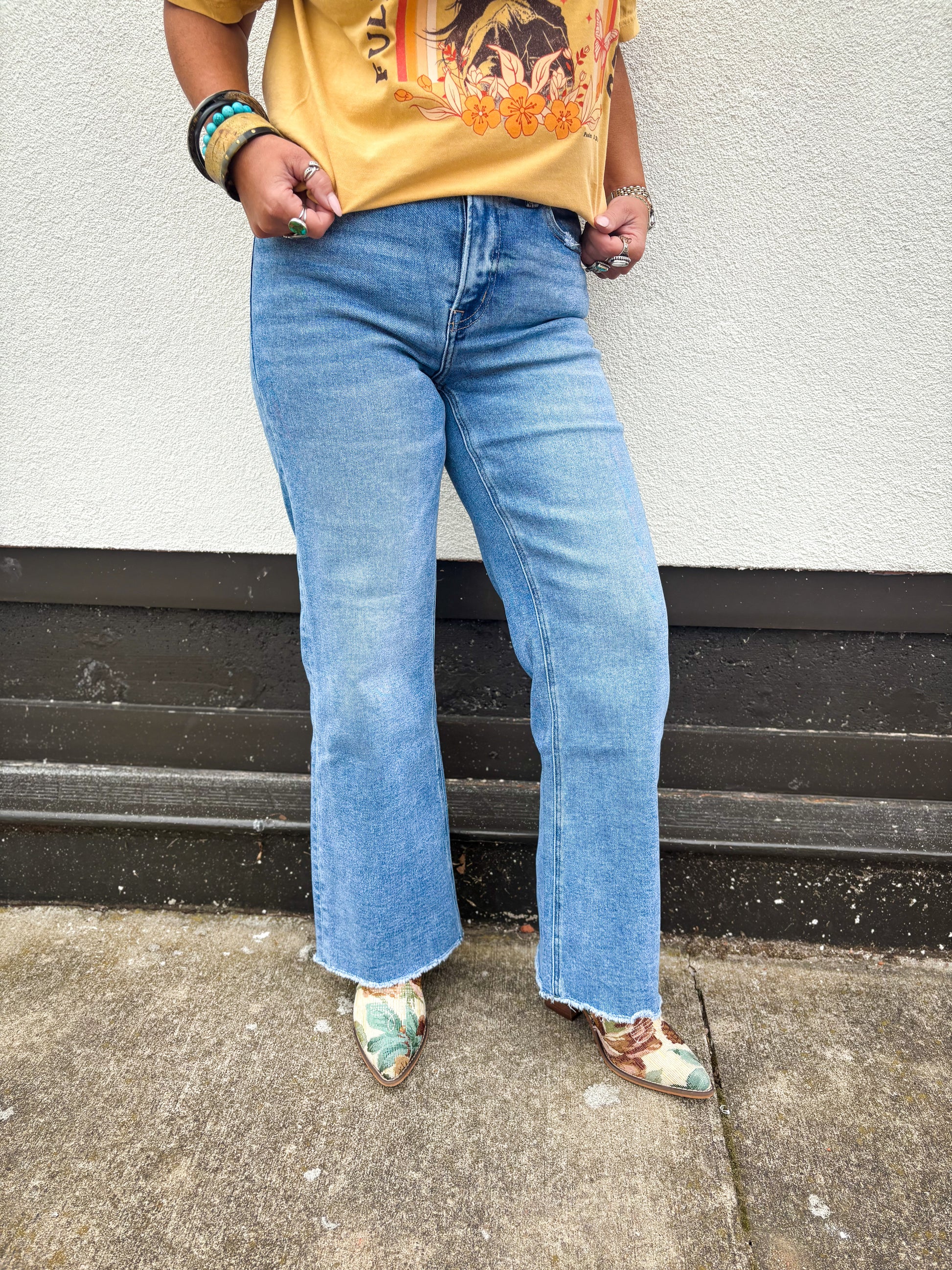 Are you looking for a mild wide leg jean with some stretch? We cannot keep these in stock! A great medium wash that pairs perfectly with a graphic tee or blouse! The are a high waisted fit with stretch!