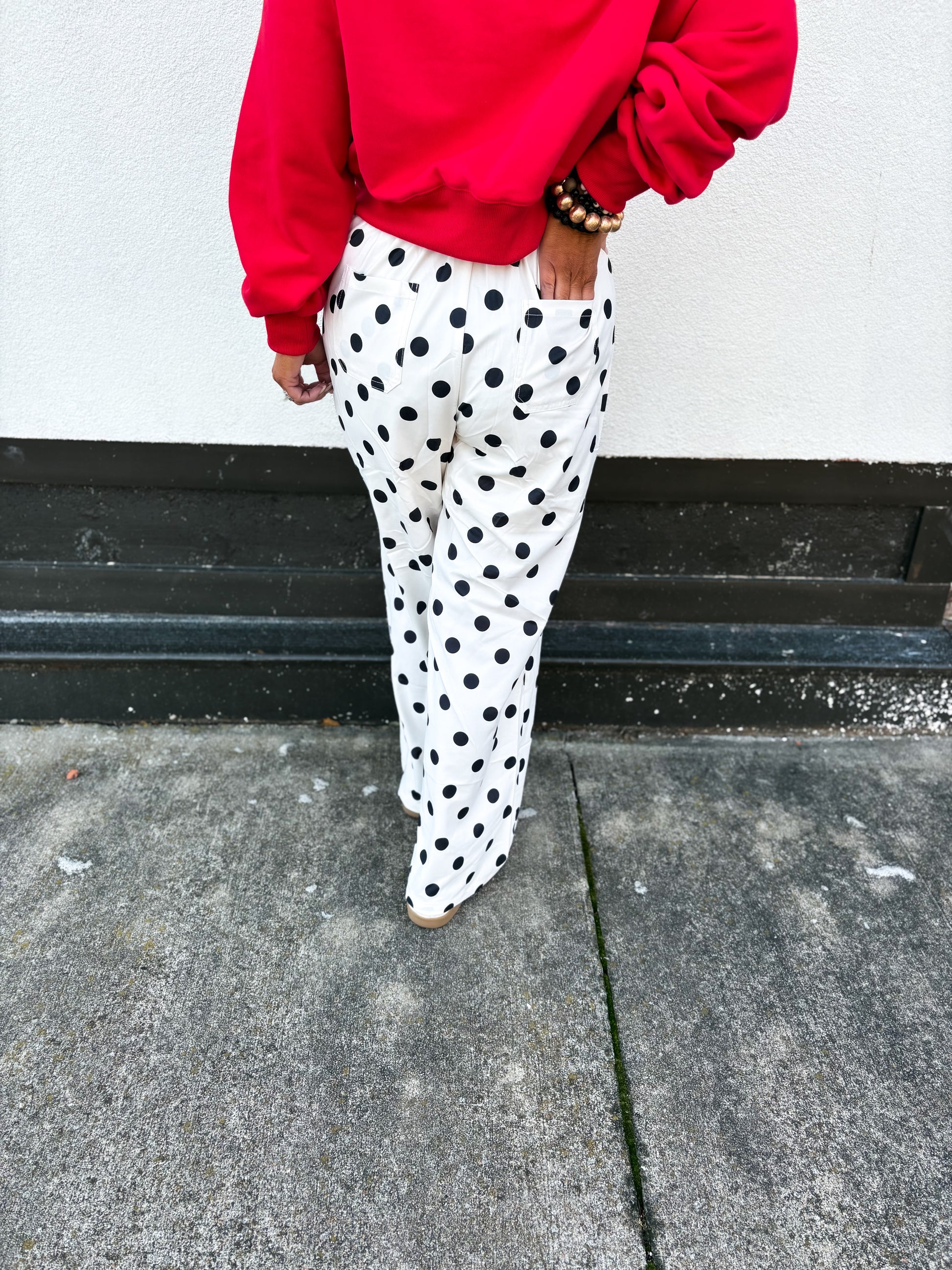 Chic, playful, and effortlessly polished, these white polka dot pants are the perfect mix of fun and sophistication. Designed in a silky, lightweight fabric, they drape beautifully for a flattering fit that feels just as good as it looks. The classic white base with black dots gives them a timeless vibe, making them easy to style for the office or dress down for a relaxed day out.