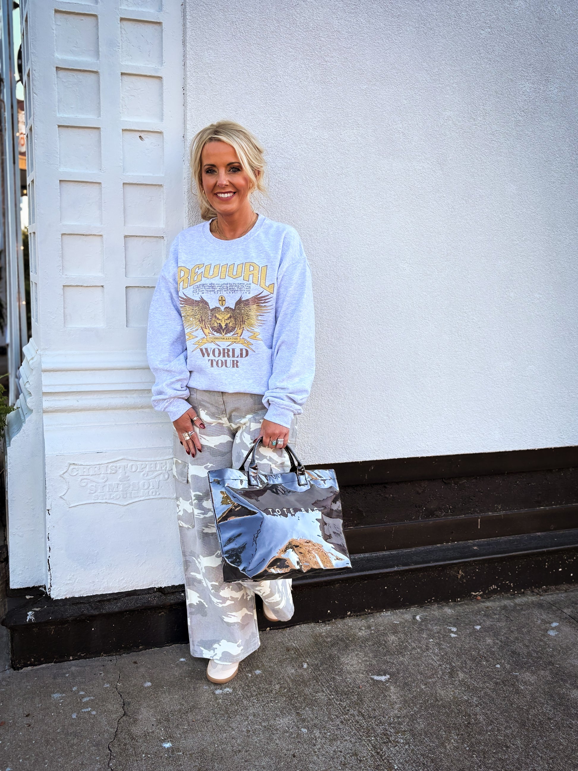Bold faith meets vintage style in our “Revival World Tour” Crewneck. Featuring a striking eagle graphic and 2 Chronicles 7:14, this sweatshirt carries a message of hope, healing, and renewal. With its soft, cozy fabric and timeless design, it’s the perfect way to wear your faith with confidence and purpose.