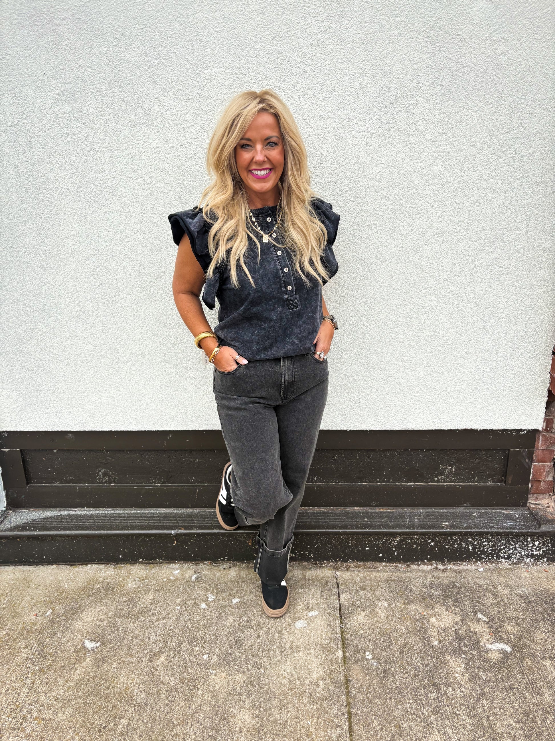 A great basic with a ruffle! Dress this top up or keep it casual! It is a great go to, to have in your closet! A soft material that will have you feeling comfortable while look adorable!