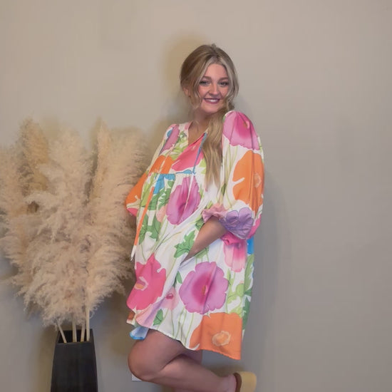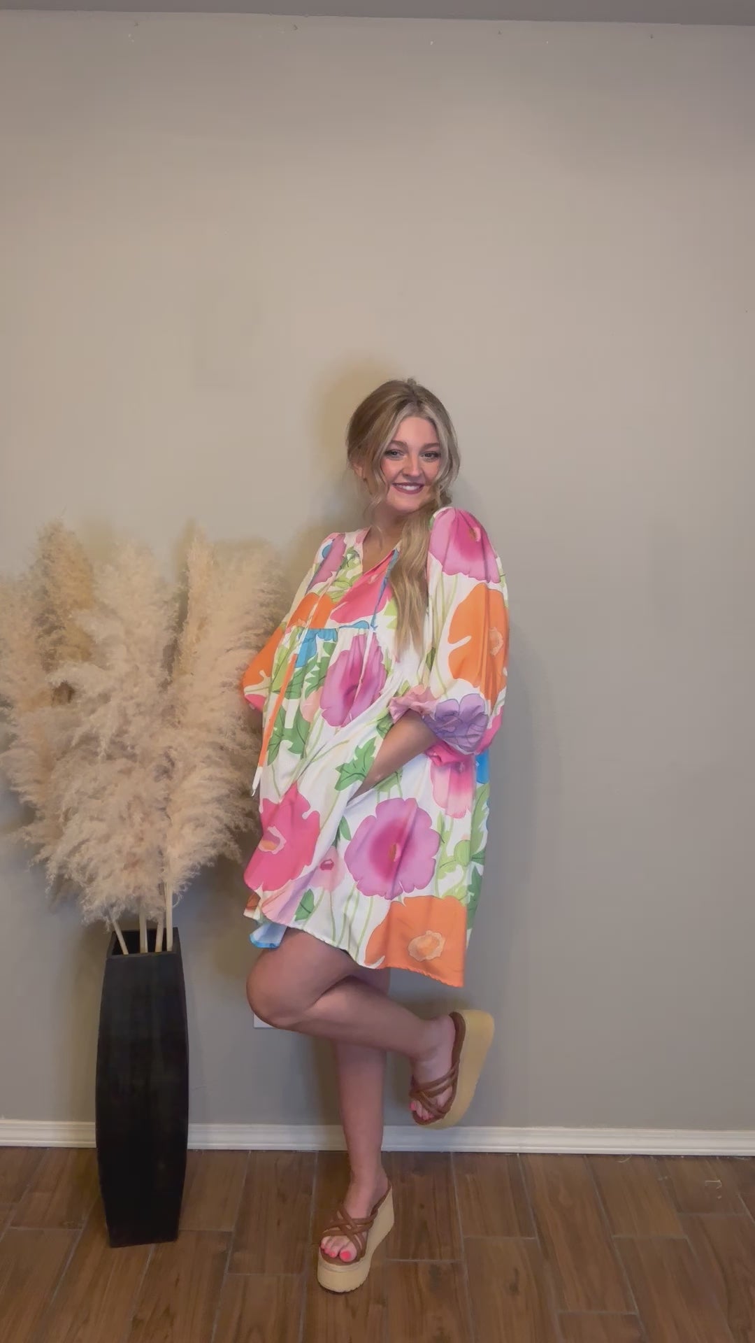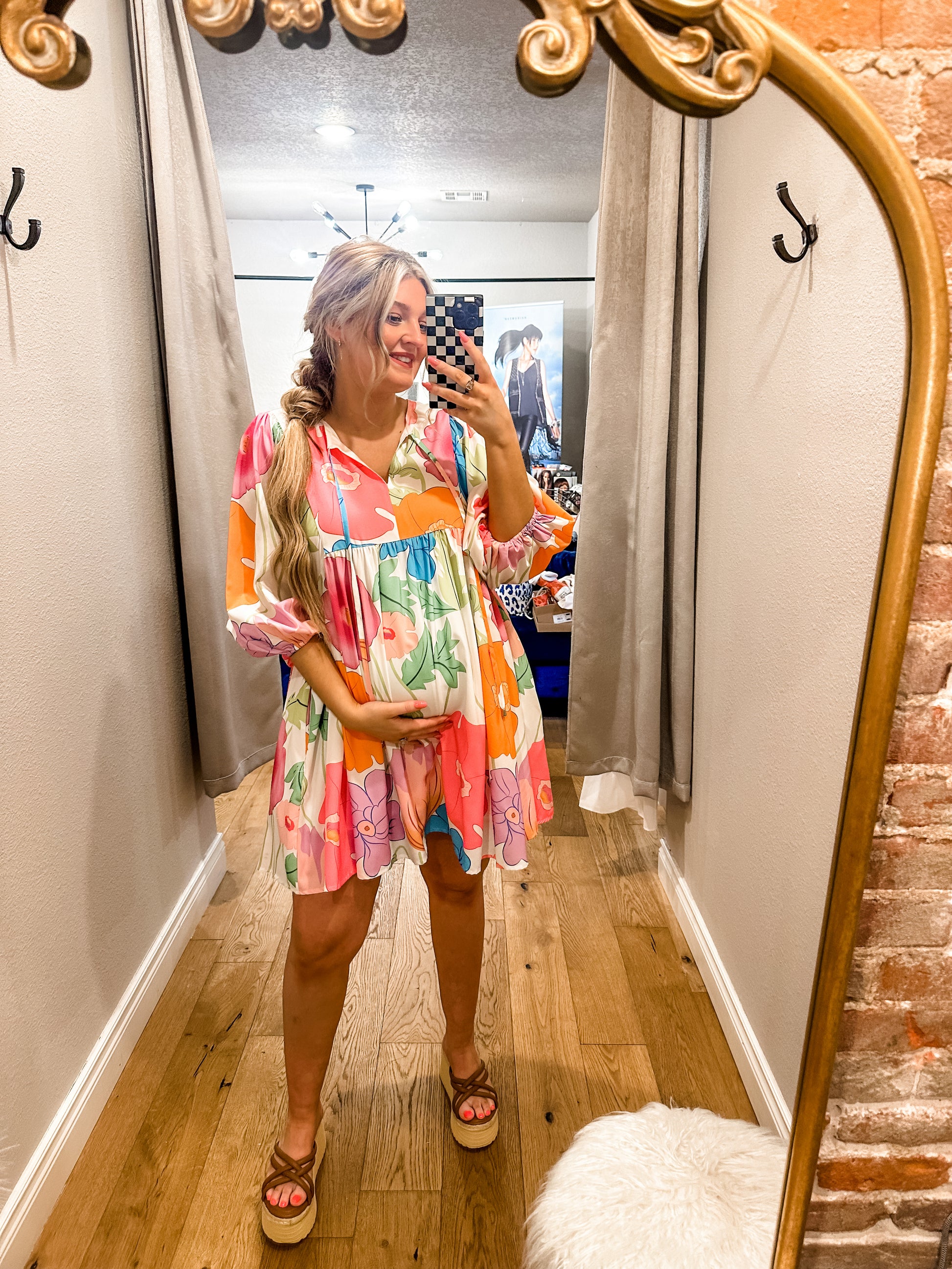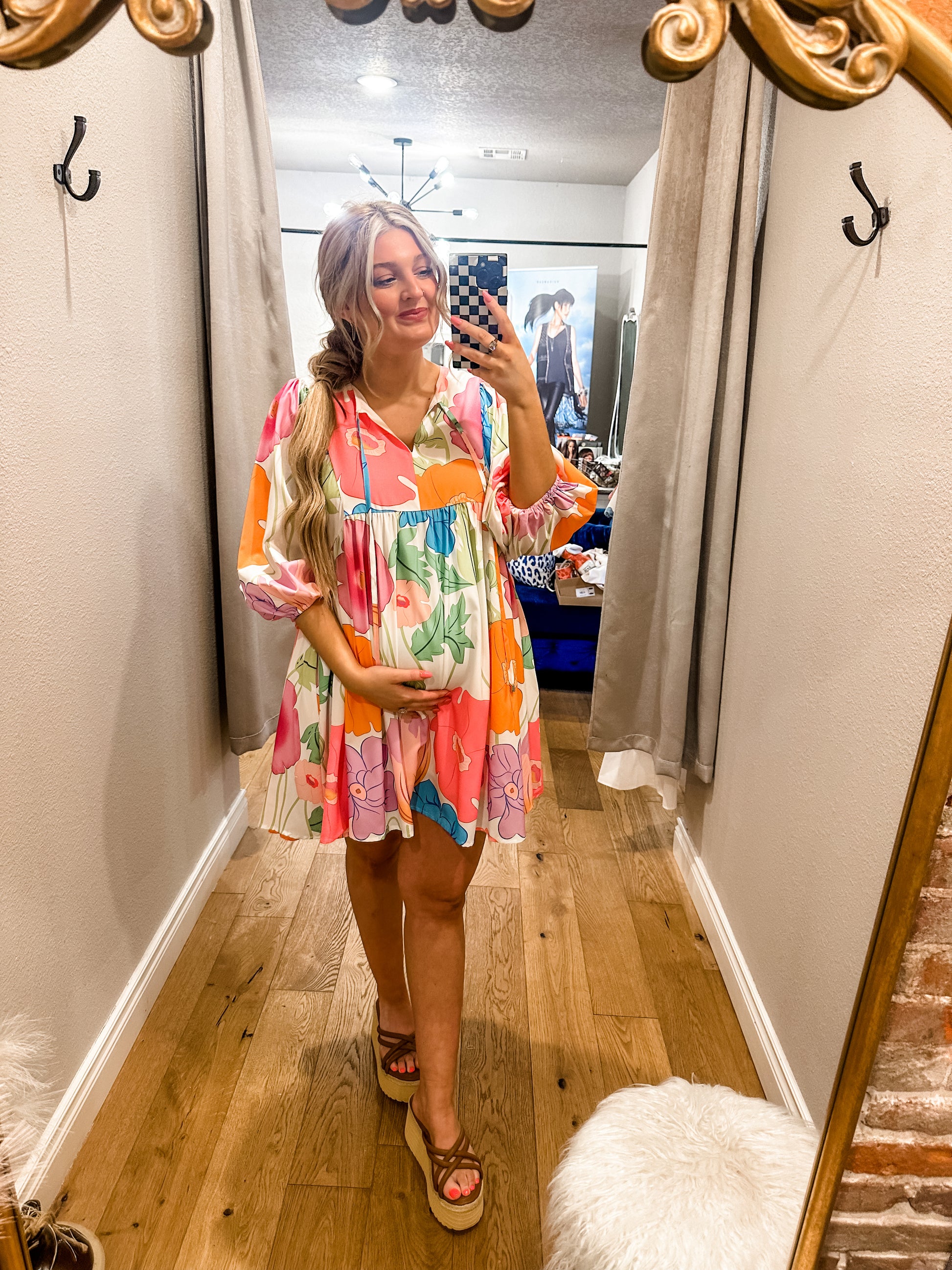 Ladies, you need this dress! We are loving the floral pattern and the fun color platte! We love it paired with a strappy wedge! A dress that is perfect for everyday, works, or showers! Hits mid thigh.