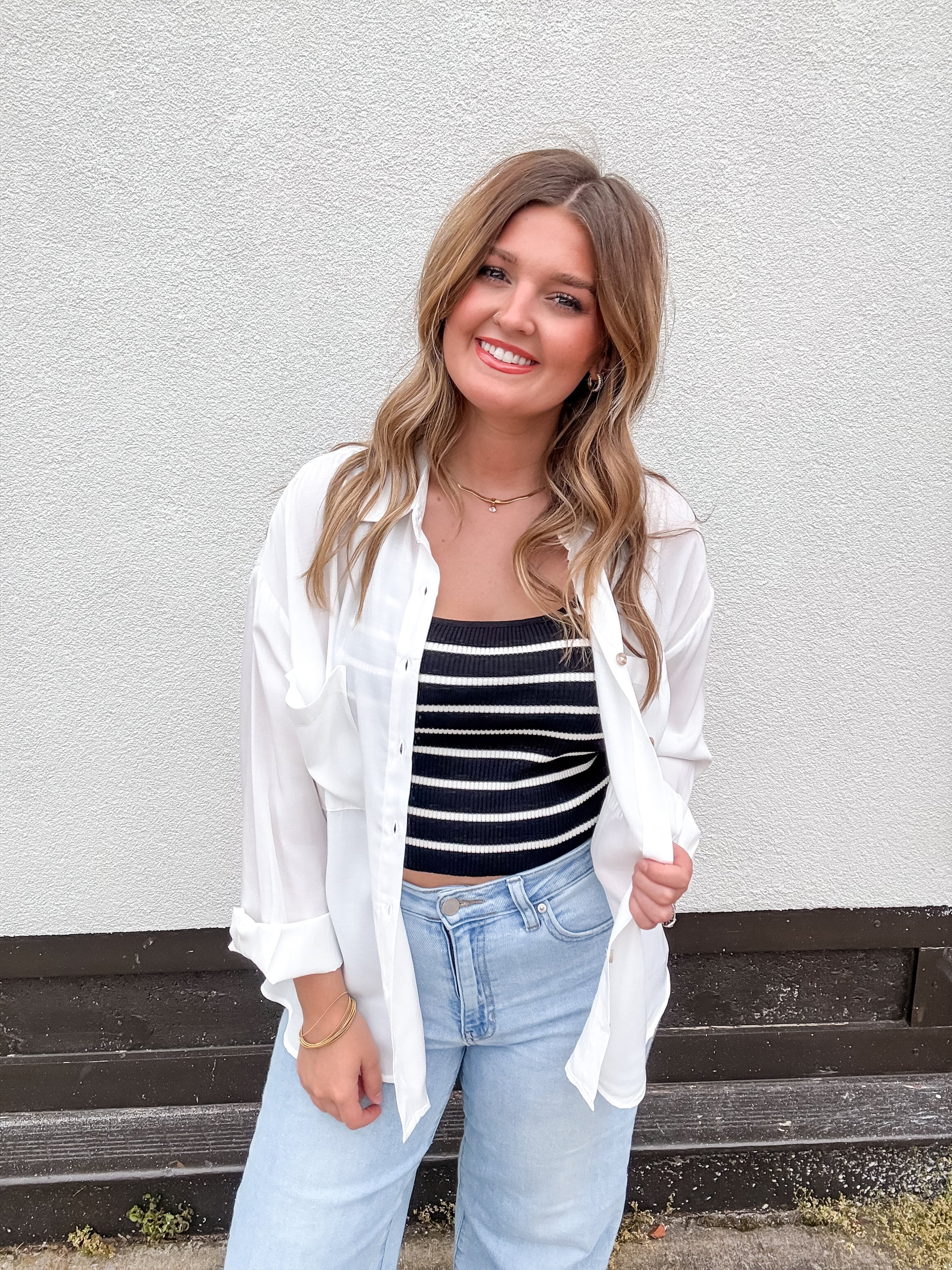 The perfect tank to wear on its own or layered under a button up! A light weight ribbed material that will be your go to all summer long! Makayla has layered it with our very versatile Simply Chic Button Down.