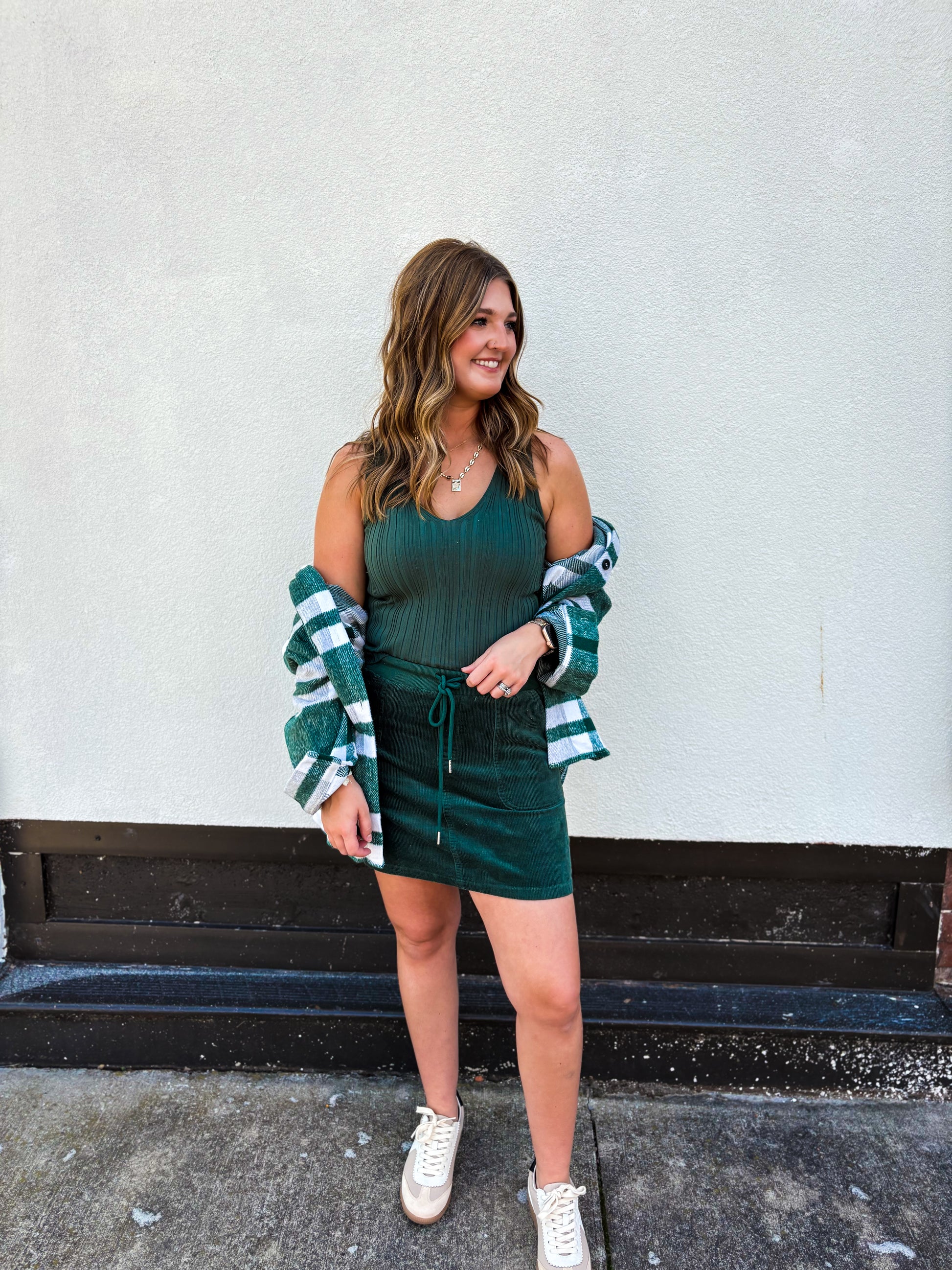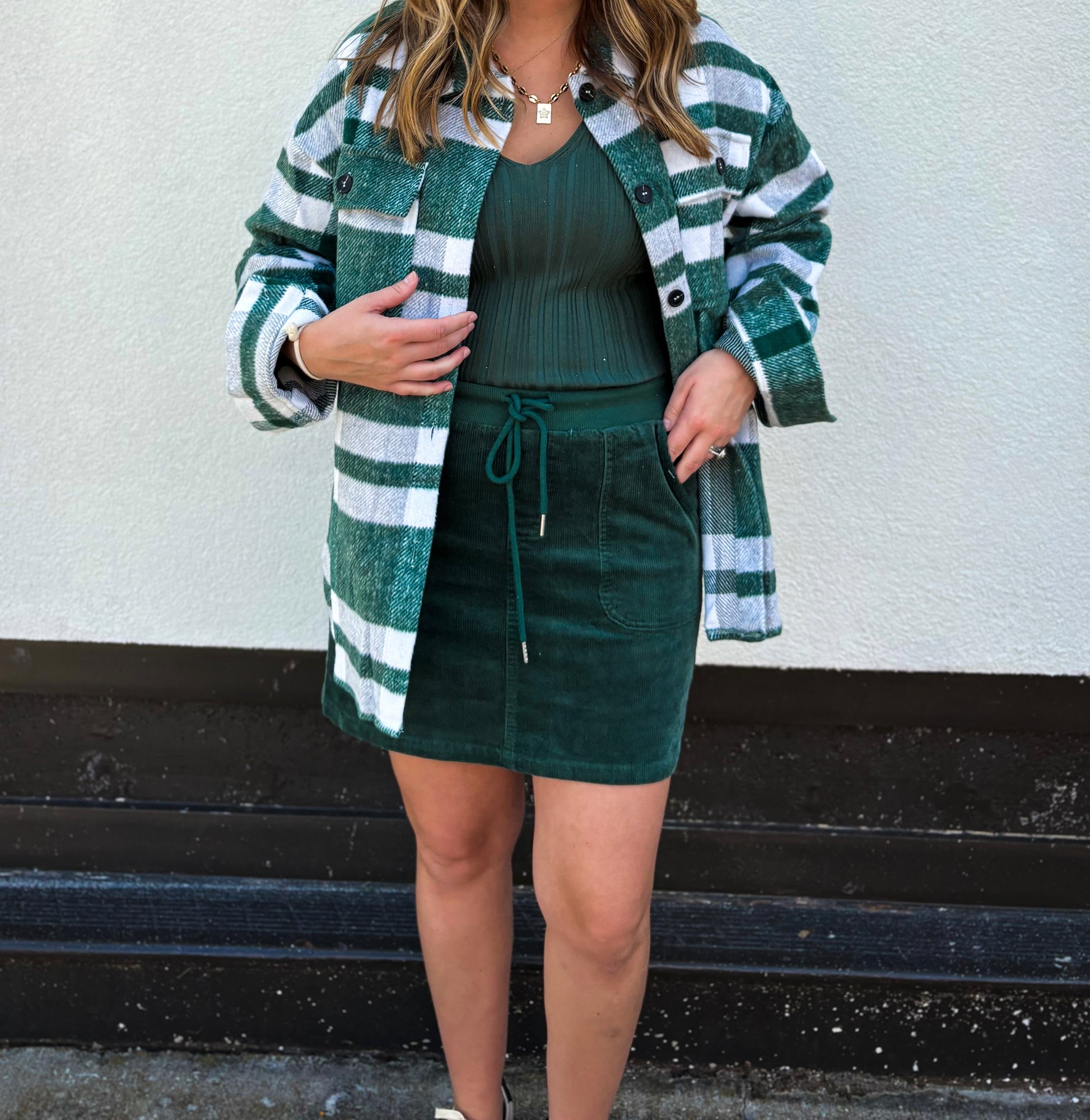Step into fall in style with this green corduroy mini skirt! With its soft texture and flattering fit, it’s the perfect mix of classic and cool. Pair it with a cozy sweater or a Flannel for that effortlessly look.