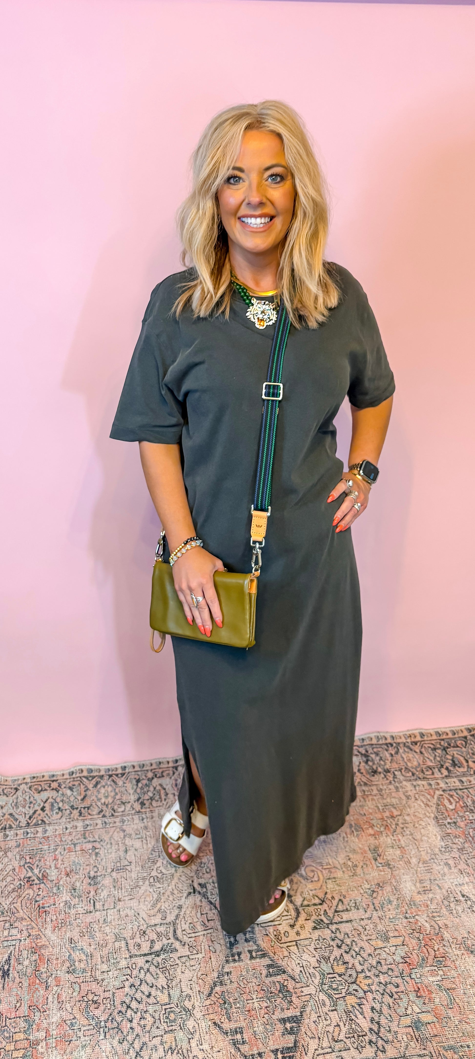 A dress that is like a blank canvas! The style options are truly endless! Crystal has styled it with some chunky jewelry and a sandal for a great everyday outfit! You can add a wild rag with a boot for a country concert!