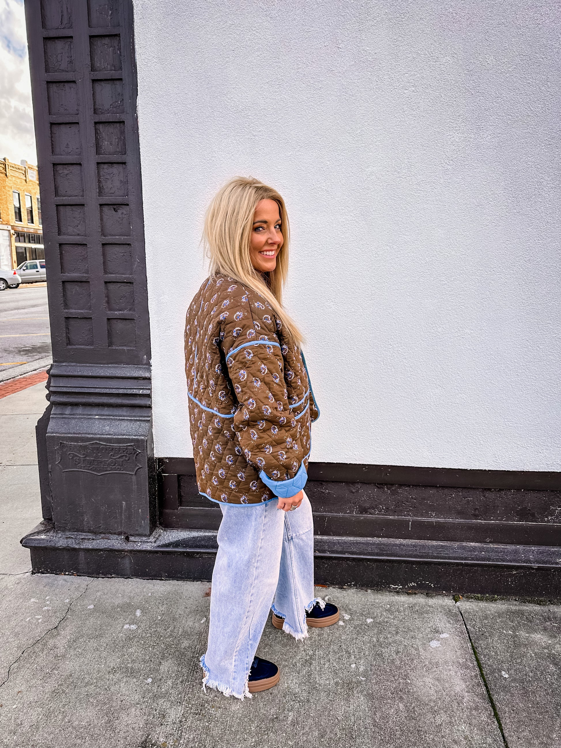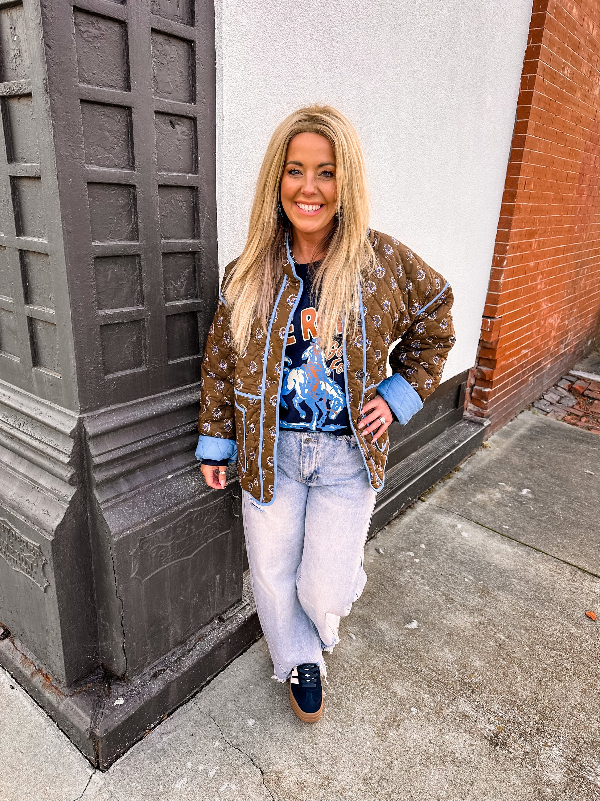 As you probably know everything quilted is a huge trend, and we can see why! This rich brown with a pop of blue is a timeless piece that can be worn with so many looks! It is the perfect weight to layer up on really cold days!